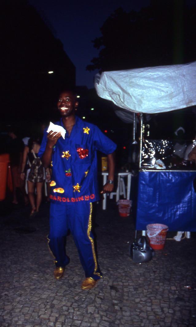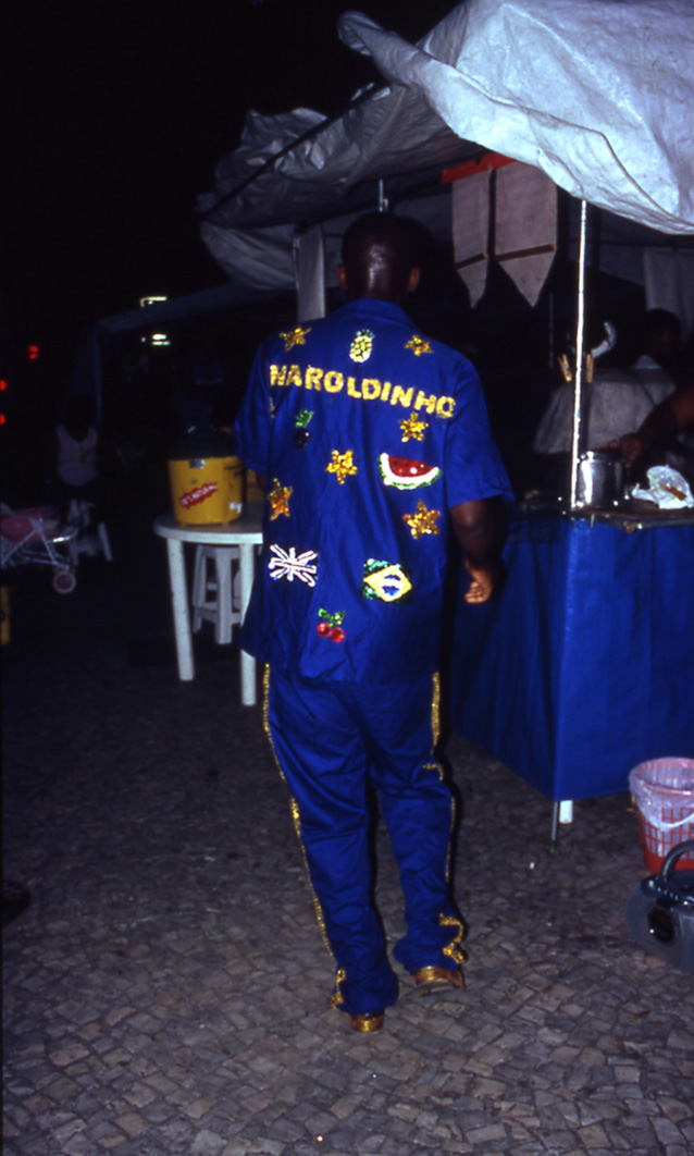 Haroldinho, “Little Harold”, is a persona created and performed by Harold Offeh in response to his experiences of Rio de Janeiro, during a two-month residency in the city. Dressed in a blue utilitarian uniform decorated with sequins and glitter, Haroldinho dances the samba in the city’s famous tourists spots, Ipanema Beach, the statue of Christ, and Maracana Stadium. Shaped in response to the conflicting character of the city, Haroldinho is an embodiment of the vibrancy and energy Brazilian culture, but also reflects Brazil’s status as a newly developing nation that is dependent upon a low-waged, low-skilled labour force. The blue uniform Haroldinho wears is commonly worn by manual laborers, the home-sewn decorations an unconvincing replica of the professional carnival costume. Bringing two sections of Brazilian life that are not usually seen together Offeh appears to recognize that while the razzle-dazzle of Brazilian carnival is the outward sign of Brazilian culture it is the unseen workers who sustain national life.