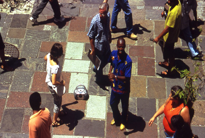 Soliciting and activating the spectators’ preconceived notions of Brazil, through his use of dance, samba music and the site specificity of his performances, Offeh acts to question the validity of these things as national signifiers. Offeh encourages us to reconsider national stereotypes, and to question the ways in which we fabricate and perpetuate our own histories. The issue of cultural commodification, in which national cultures and identities are packaged and exported apparently unproblematically, is a central component of the work. The cultivated persona, Haroldinho, is clearly a dancing novice, whose enthusiasm is greater than his proficiency. While “Little Harold” is conversant, he is not yet fluent in Brazilian culture, raising the problems of cultural translatability, but hinting at cross-cultural similarities.