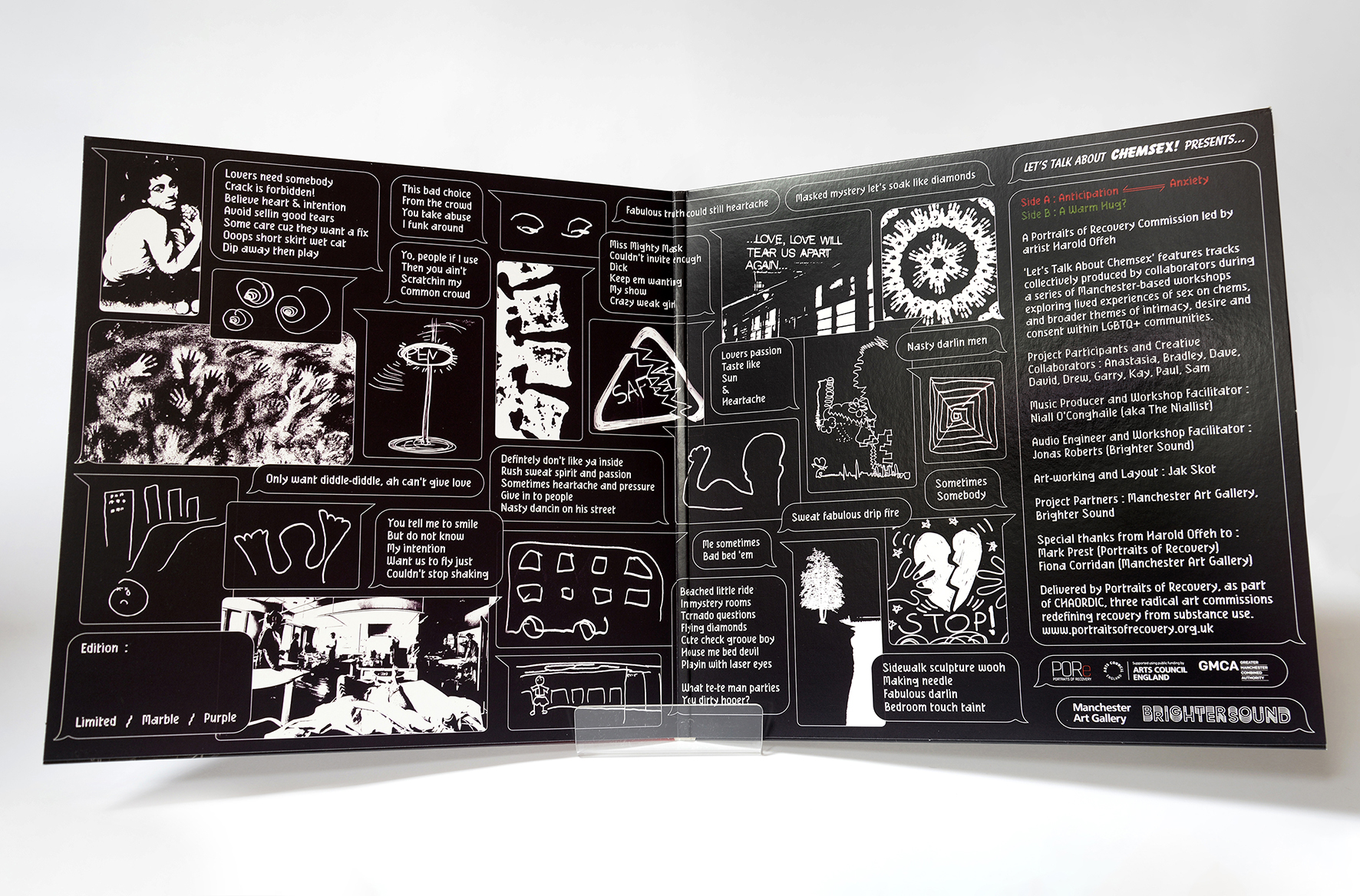 The final stage of the project was the Let's Talk About Chemsex Takeover at Manchester Art Gallery, where the 12-inch double A-side record was launched. To mark the culmination of Let's Talk About Chemsex, this event also included a rich public programme of performances, screenings and talks by both UK and international artists including Daniel Rey, Ghetto Fabulous, mandla, Sam Cottington and Valentin Ranger.