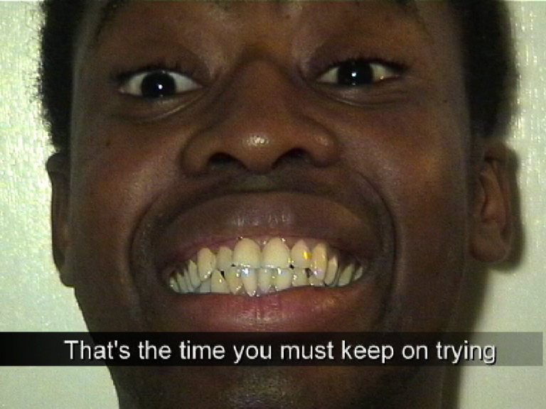 Smile was very influenced by the work of artists like Vito Acconci, Bruce Nauman and Joan Jonas. Smile arose in part as a response to a work by Vito Acconci and in part a literal translation of the song Smile, written by Charlie Chaplin and, in this case, sung by Nat King Cole. Chaplin’s lyric sets out a specific set of instructions, “smile through your fear and sorrow”. The video simply follows this instruction. In the original version of this piece the smile is maintained for 34 minutes. In this version it is cut to the length of the song, just under 3 minutes.