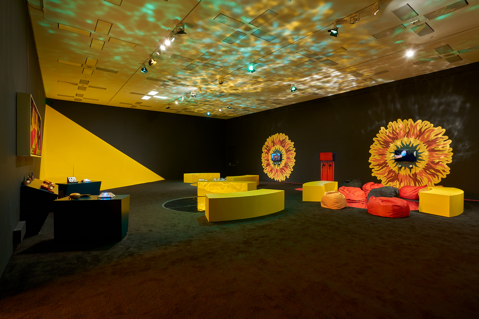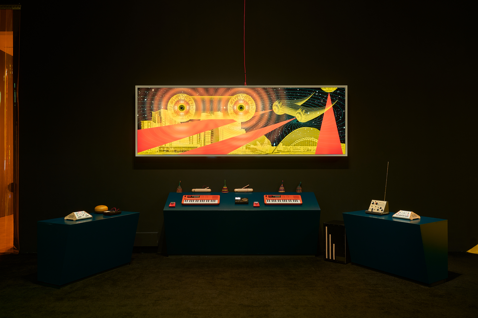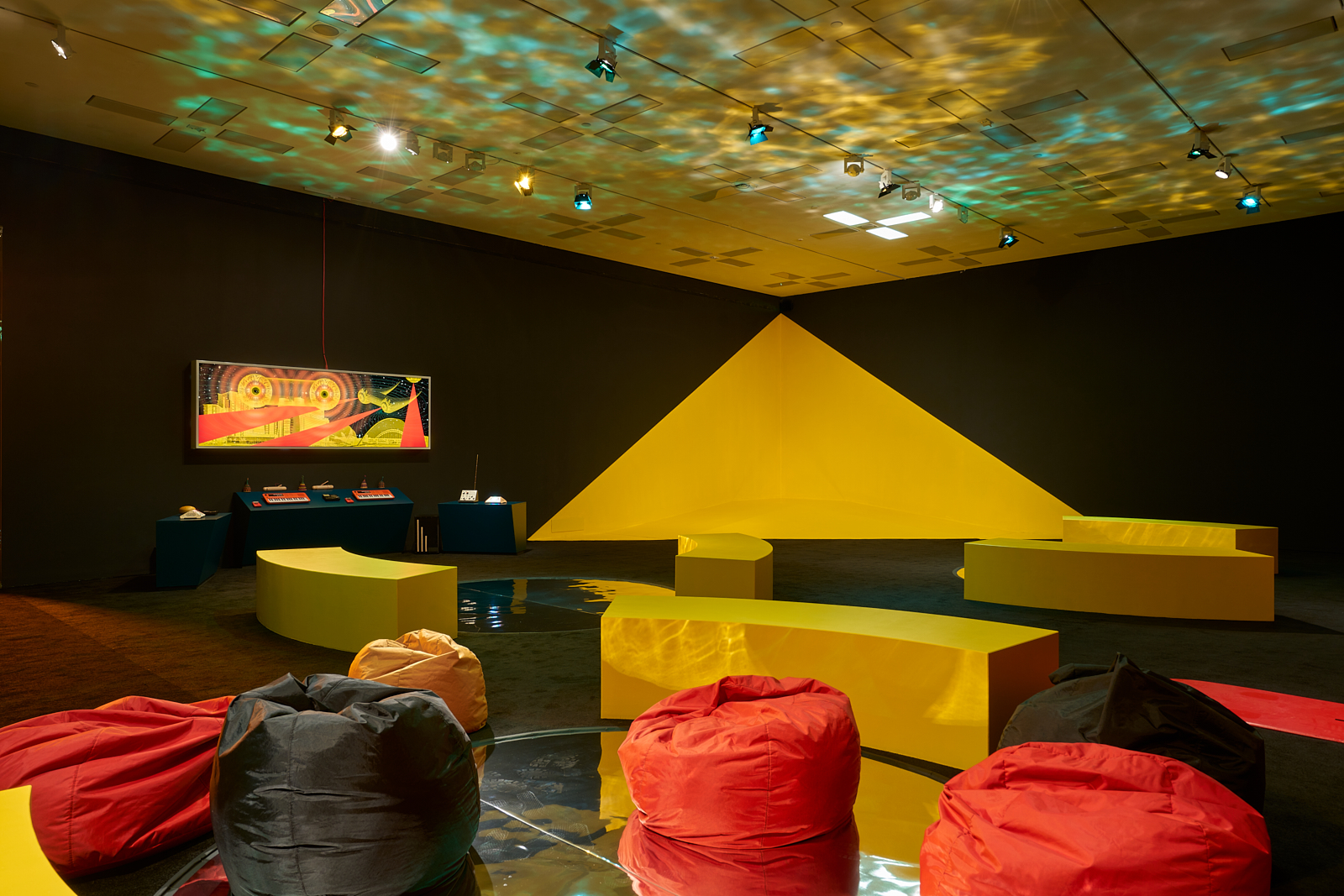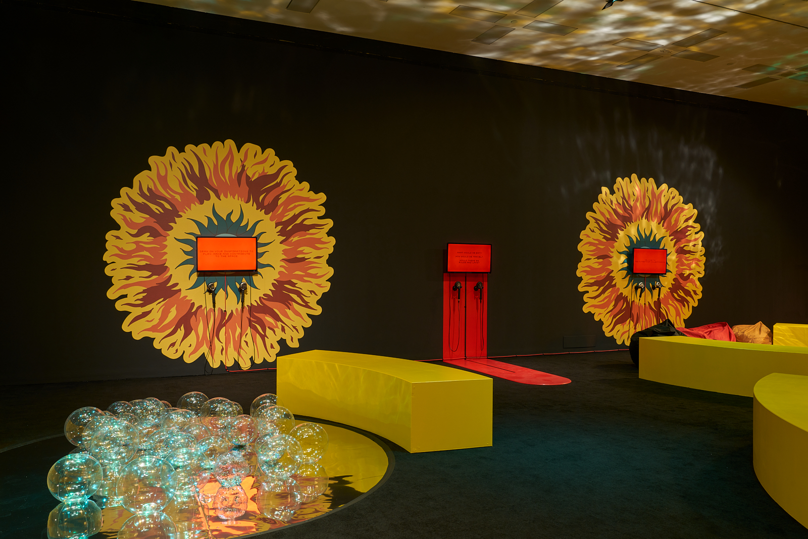 You are invited to play and interact with activities and materials inspired by sci-fi, possible futures, and imagined utopian places. Different zones explore different sensory experiences. Experiment with weight and mass in the habitat zone, identity and performance on the yellow stage, make patterns with sound, and prophecies and predictions for the future with text.