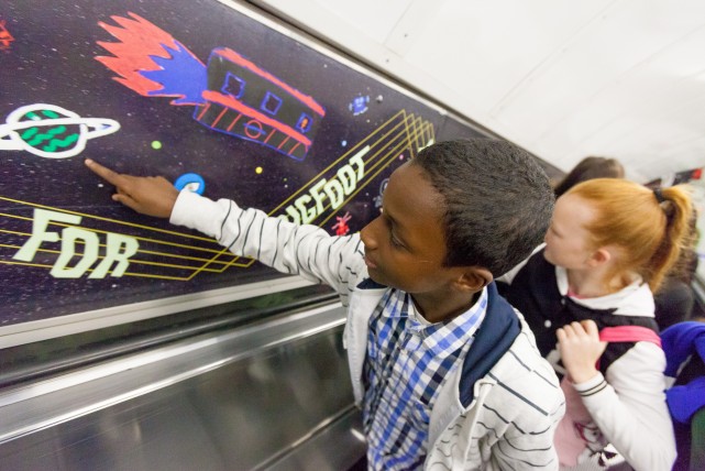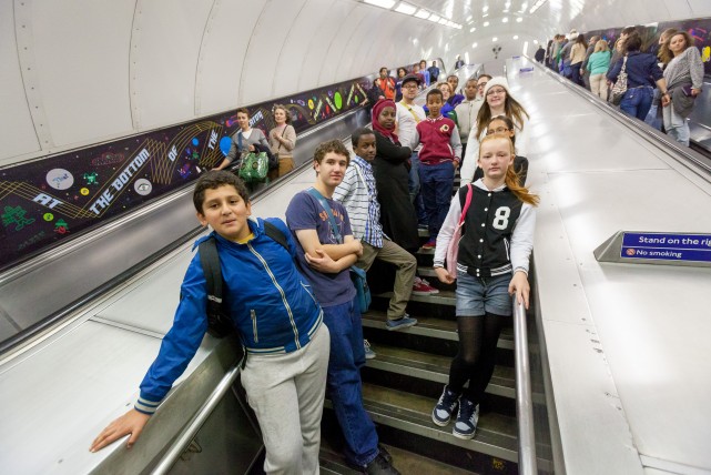 The young people travelled with Offeh to discover parts of the Tube and the city that they had never explored before. They visited the V&A Museum of Childhood, the Science Museum and the London Transport Museum, encountering art on the Underground along the way, such as Mark Wallinger’s Labyrinth, a unique artwork for every Tube station. At Bethnal Green station, a behind-the-scenes tour by Underground staff gave them a glimpse of how the station operates and how devices like the PA system work.