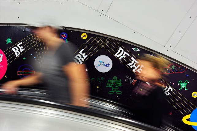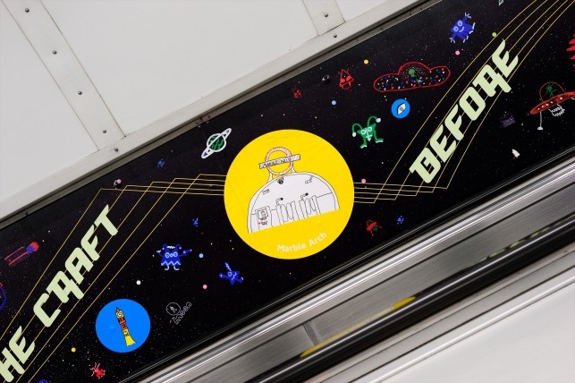 In this science-fiction inspired project the Central line is transformed into an interstellar superhighway. The familiar station symbols on Harry Beck’s Tube map have evolved into planets: stopping-off points on the Lunar Express, appearing like notes on a galactic musical score.